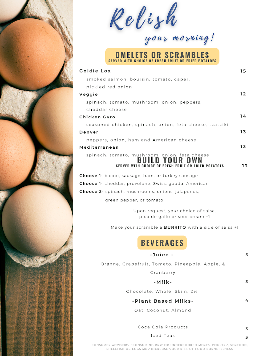 Relish's standout offerings also include unique items such as the Goldie Lox, combining smoked salmon with flavorful accompaniments, ensuring a satisfying start to your day. The barista menu shines with an impressive selection of espresso drinks, including specialty lattes and creamy cappuccinos. Guests rave about the rich flavors of the Iced Coffee selections, perfect for a midday pick-me-up.